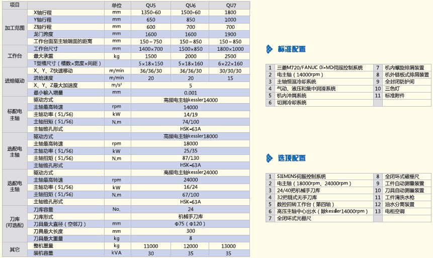 QU系列高速龙门加工中心,优化设计的龙门框架结构,具有更好的刚性、热稳定性和持续精度;配置先进的电主轴系列和高动态响应的驱动系统,使加工更高速、高精、高效;赋予环保、节能的设计元素,广泛应用于汽车、航空航天、模具、内燃机、家电、通用机械等行业。