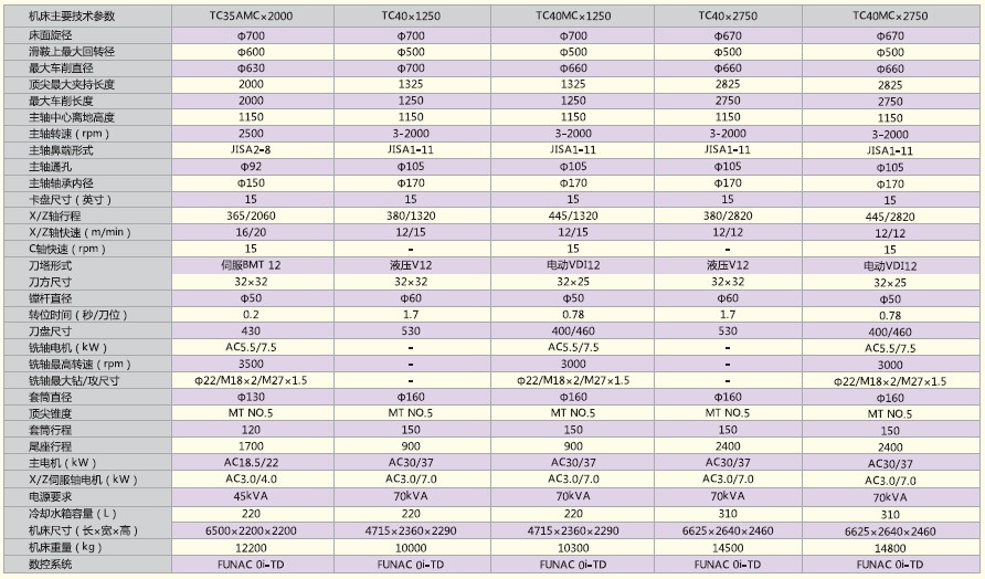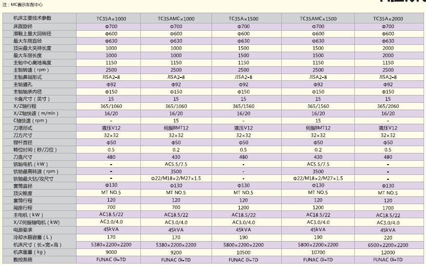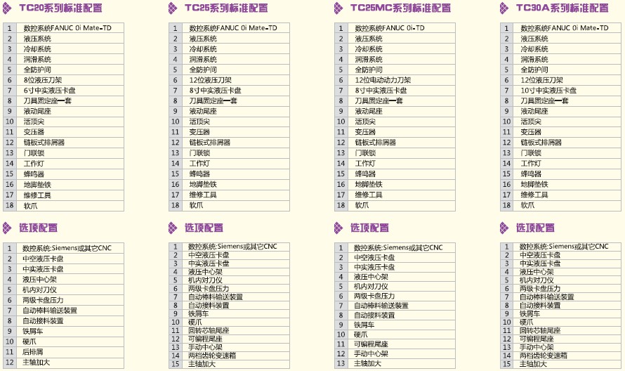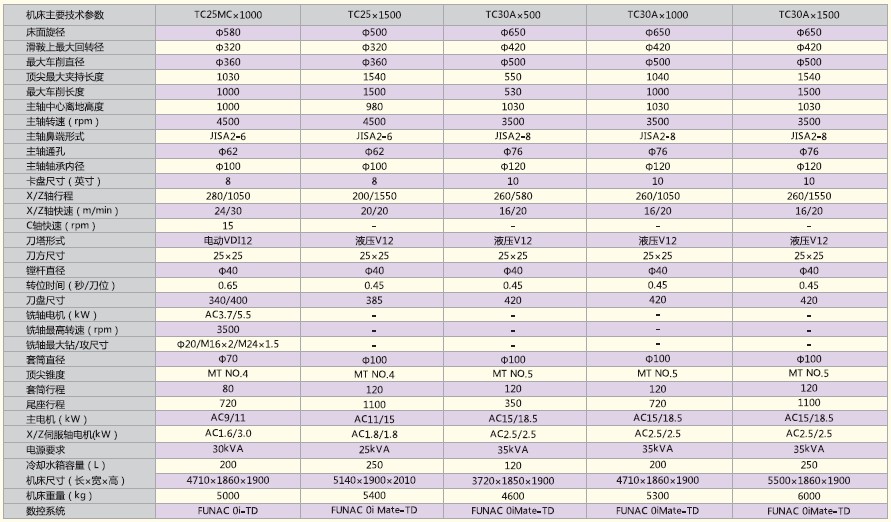 TC系列数控车床为整体床身,45°倾斜导轨,机电液一体化布局,全封闭式防护间,体现高精度,高刚性,高速度。TC25及以上机型为硬轨配置,TC25还有线轨选择,TC20为线轨机型。大规格可以选择齿轮变速主轴箱及程式尾座。液压回转刀塔,可实现刀具内冷功能。