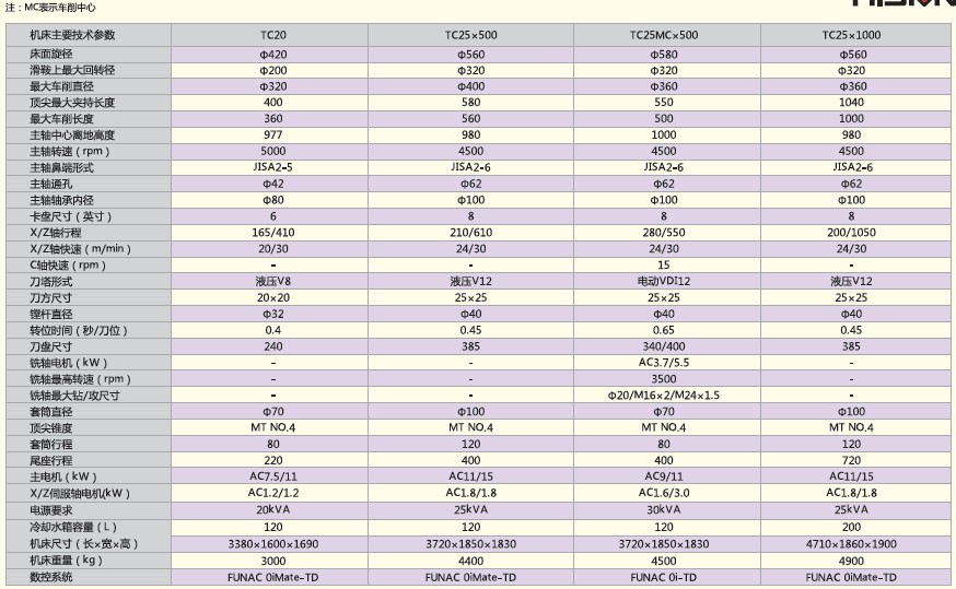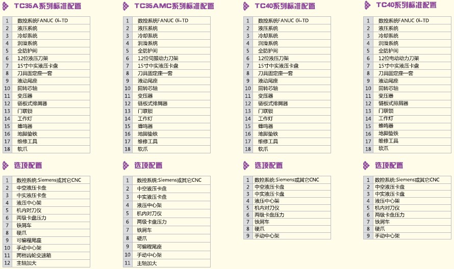 TC系列数控车床为整体床身,45°倾斜导轨,机电液一体化布局,全封闭式防护间,体现高精度,高刚性,高速度。TC25及以上机型为硬轨配置,TC25还有线轨选择,TC20为线轨机型。大规格可以选择齿轮变速主轴箱及程式尾座。液压回转刀塔,可实现刀具内冷功能。